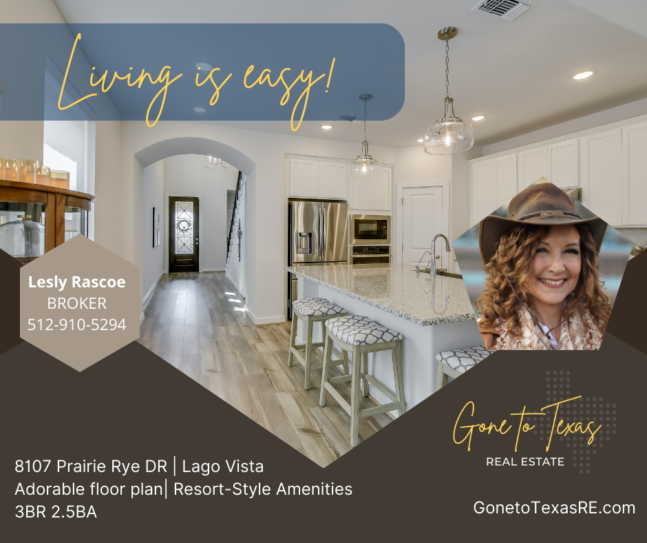 Bright & white open floor plan, welcoming living spaces & cute patio in Lago Vista's treasured master-planned community, Lakeside Tessera. Surrounded by the lush Balcones Canyonlands & the sparkling waters of Lake Travis, residents enjoy resort-style living with an infinity-edge pool, 8 miles of walking trails, pavilion & a day dock. This home features upgrades including extended back patio; luxury vinyl plank extended to primary bedroom & closet, study, stairs & loft; accent walls; motorized & pull-up shades; designer pendant light fixtures over island, primary bath & in study; ceiling fan on back patio; security system; double stone retaining wall; wrought iron railing at loft & stairs; stand-alone tub in primary bath; stone accent on exterior; propane-powered fireplace; holiday lights outlet; & rain shower head in primary. Living is easy with primary suite + study + powder room on main floor & 2 bedrooms, bath & loft on second floor. Come see for yourself & find your way home!
